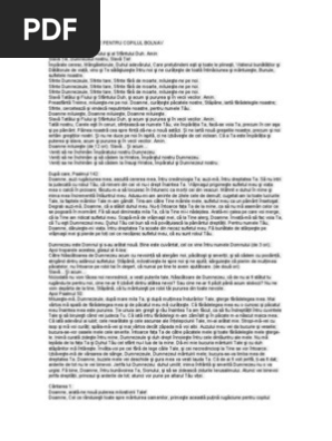 Te rugăm, doamne, vindecă durerea acestui copil, robul tău (numele). Atotputernicule doamne, tămăduitor al sufletelor și trupurilor, care cobori pe oameni și tot tu îi ridici, care pedepsești și vindeci din nou, ai mila de (numele), pentru că este bolnav (bolnavă). Canon de rugciune pentru copilul bolnav.