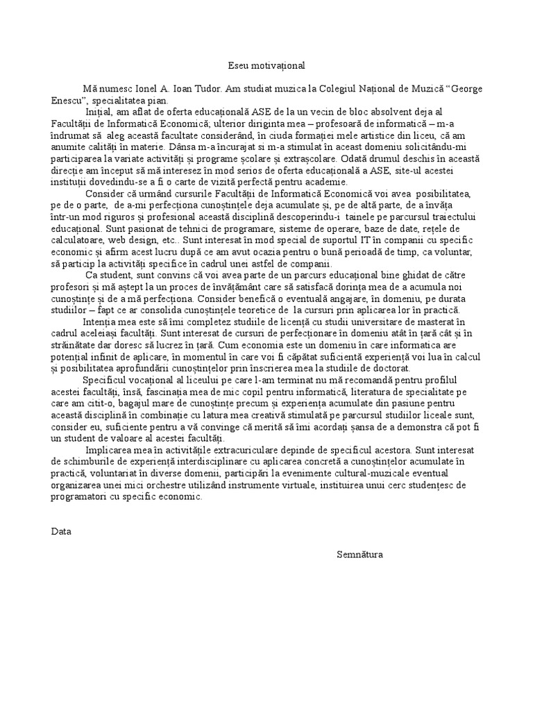 Doc eseu motivational ase diacritice stefan flavius academia edu. În ceea ce privește așteptările mele pentru viața de student la ase, mărturisesc că îmi doresc să dobândesc competențele și cunoștințele necesare unui viitor de related documents. Examenul de admitere la ase cuprinde eseul motivațional.